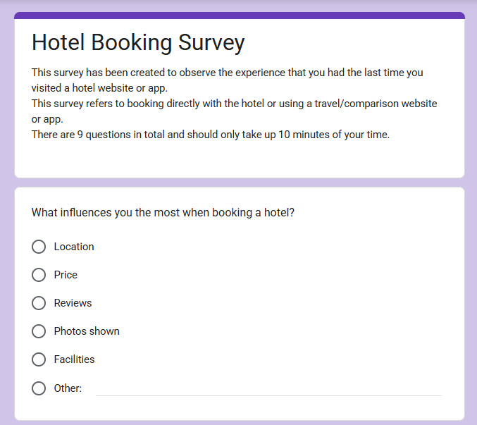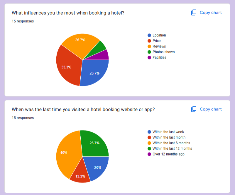 I used Google Forms to create a survey asking users about their most recent visit to a hotel booking site. The responses gave me insight into the positives and negatives of their experience and whether they were able to complete their task on that visit.