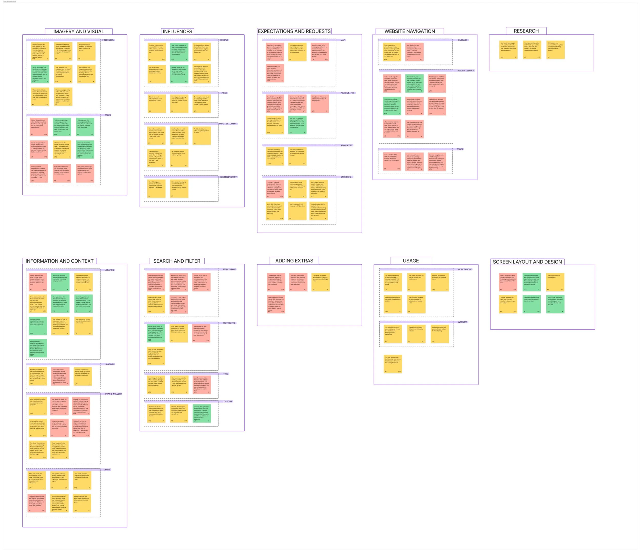 The affinity diagram was the start of my analysis from the research I had conducted. I gathered observations from all my previous work and created a document that contained notes that were neutral, positive or negative. I then organised these notes into groups and further sub groups. The groups consisted of imagery/visual, influences, navigation, search and filter and more.