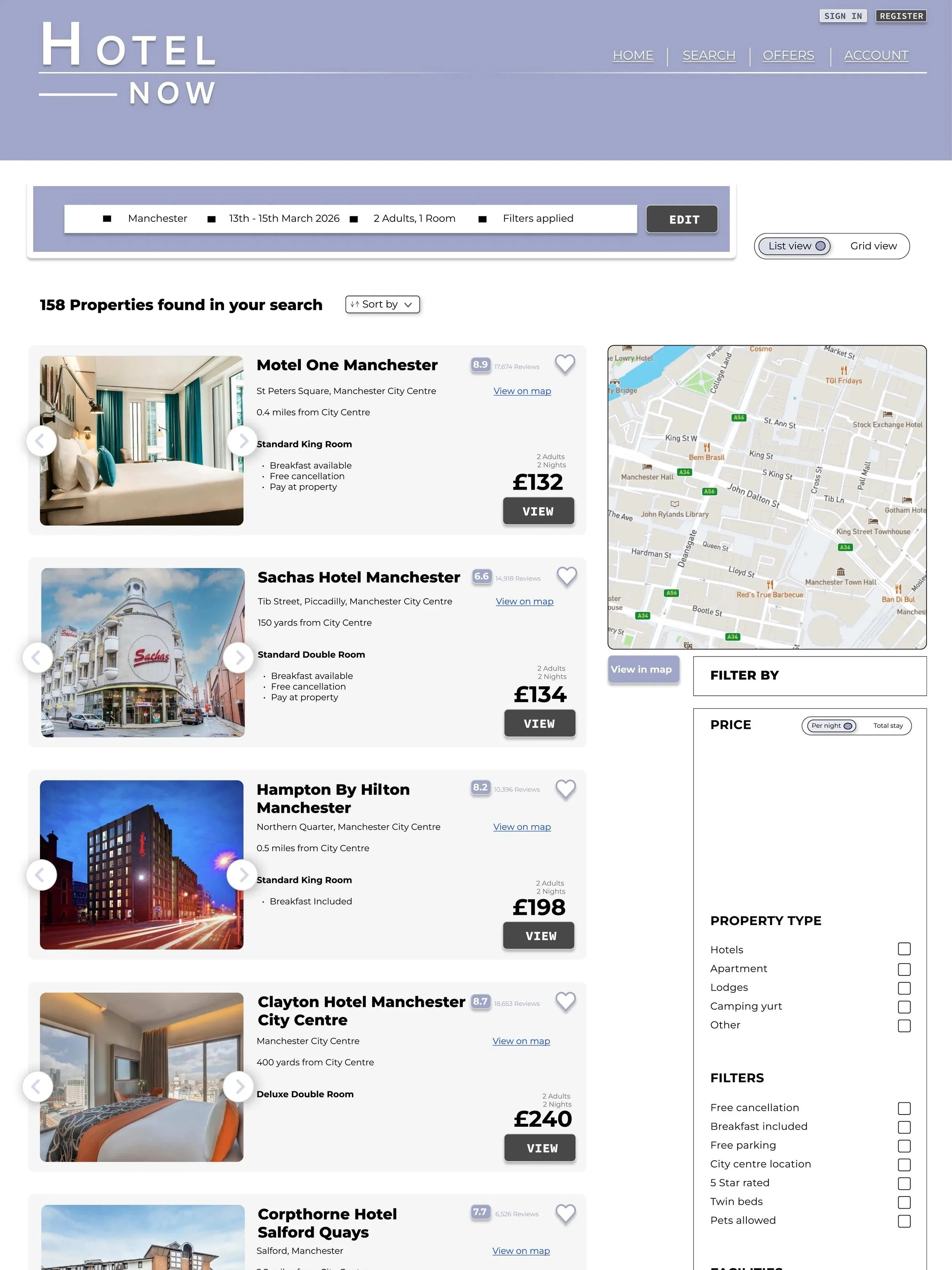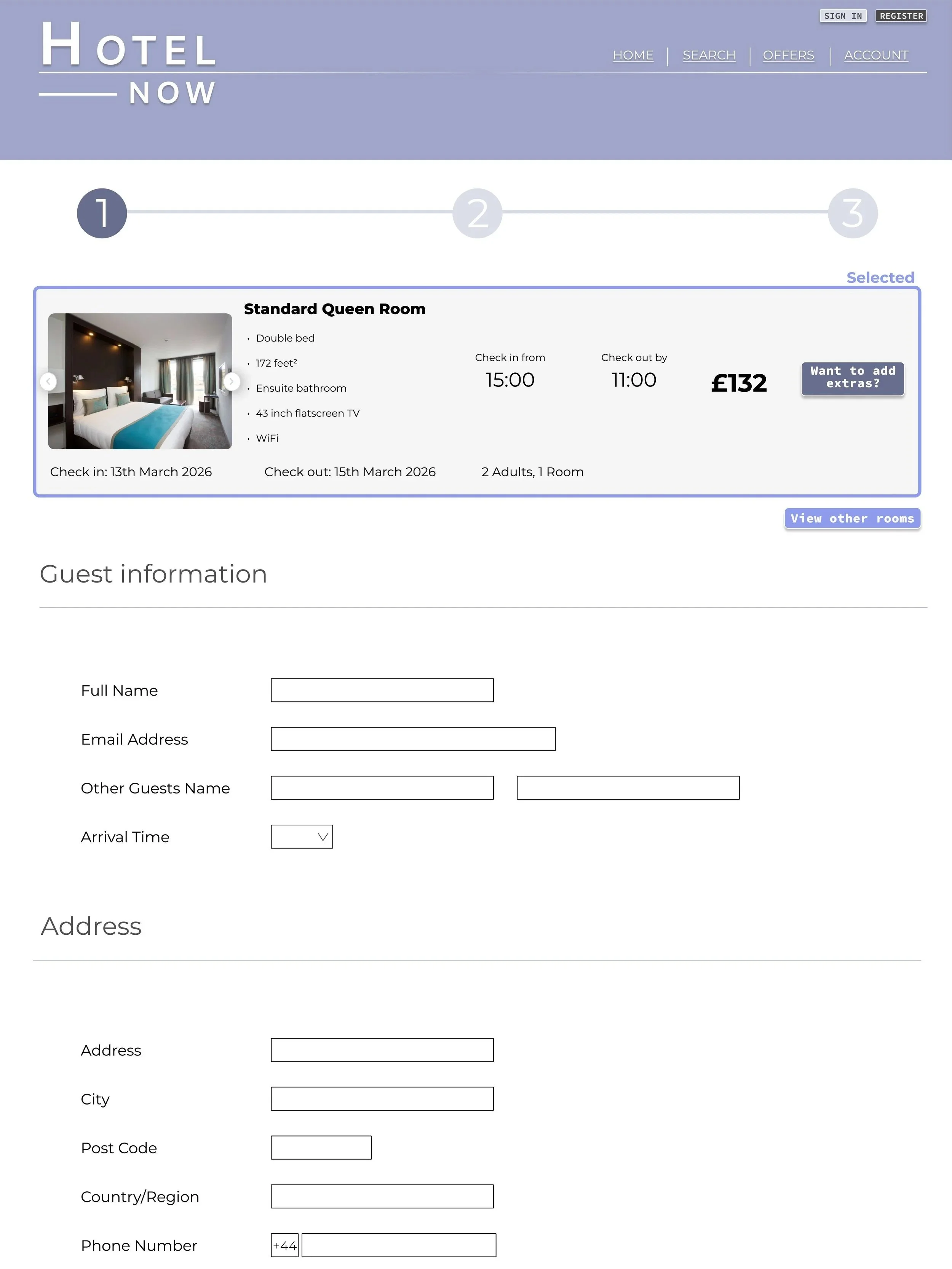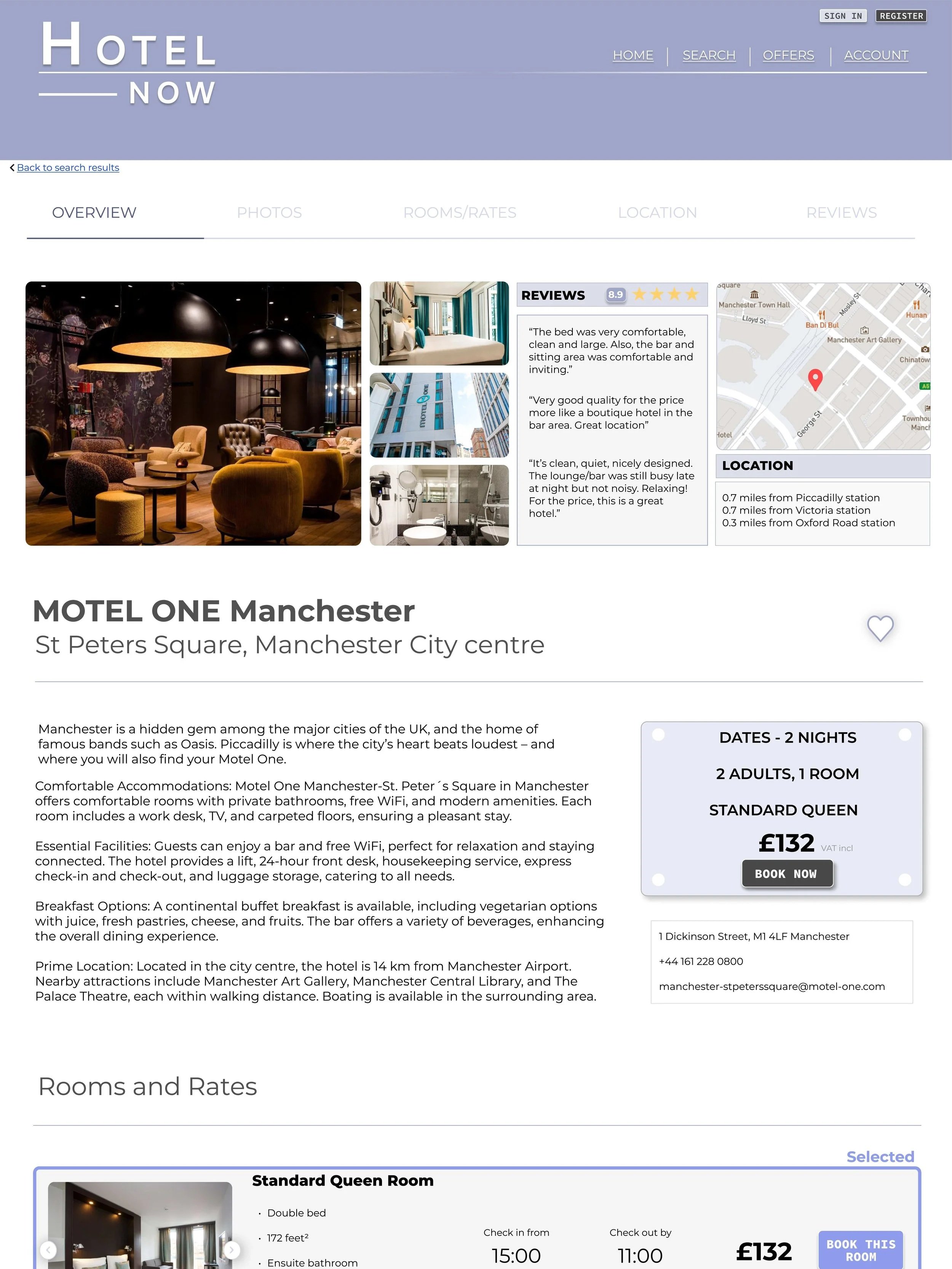 I created the medium-high fidelity prototype using Figma. Using the wireframe sketches as the starting point, the design continued to develop as more detail was added. Reflecting on what I had learnt about what users want, I made sure I followed design conventions and patterns for hotel sites as well as adding any improvements that they would need.