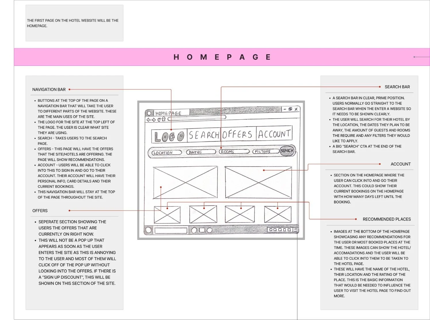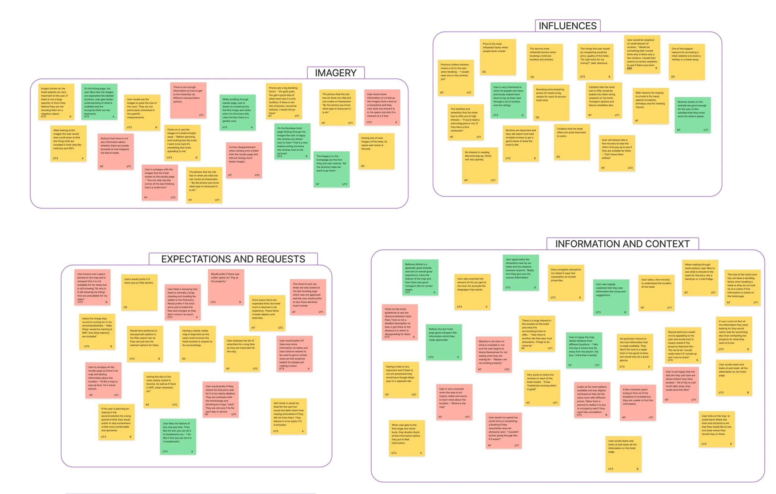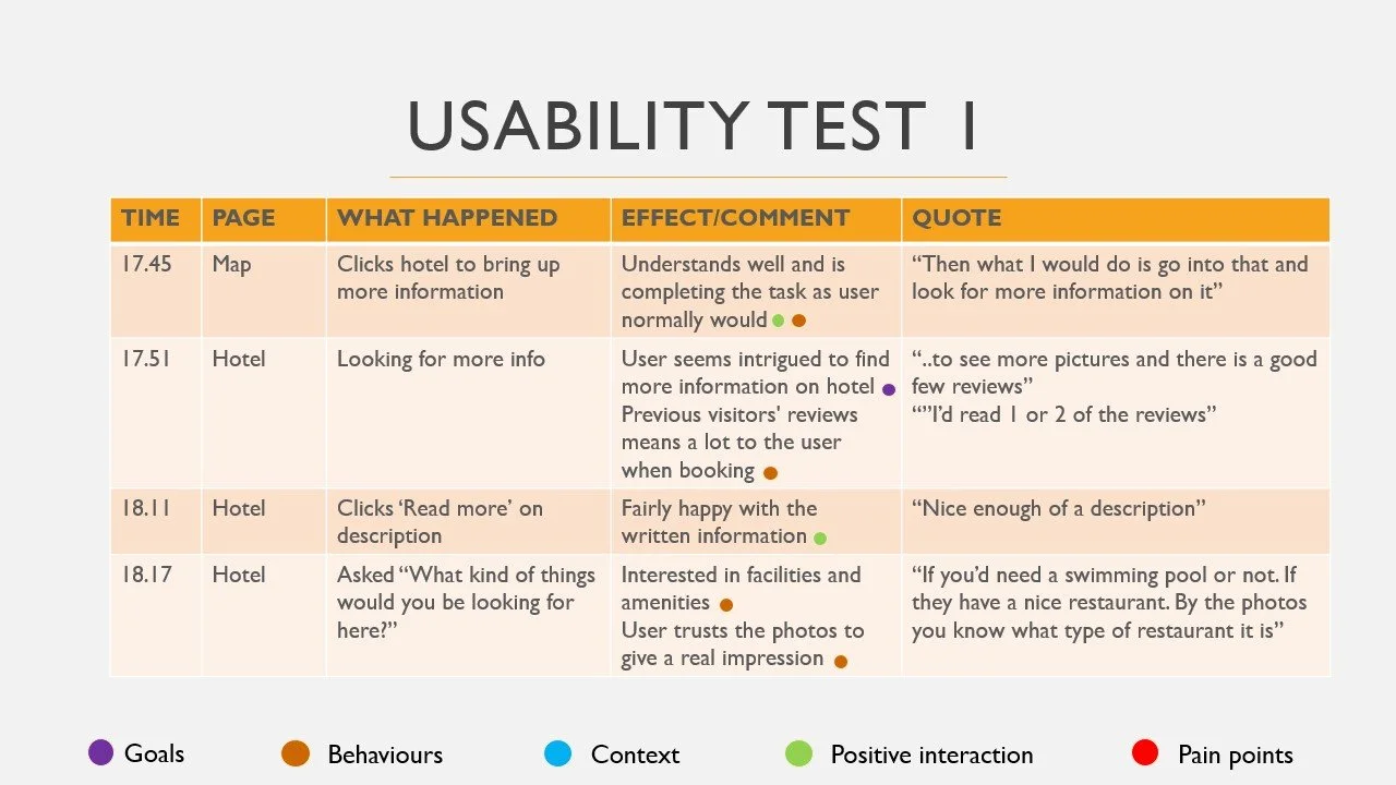 I watched two hotel desktop usability tests and took notes on goals, behaviours, context, positive interactions, and pain points. I made sure my notes were concise yet insightful. From this, I realized the importance of clear, eye-catching imagery and plenty of reviews, as these strongly influenced users. I also observed whether the website guided users through the experience or if they navigated it their own way. In both cases, users started by using the search bar immediately, which inspired me to make this feature stand out on my own site.