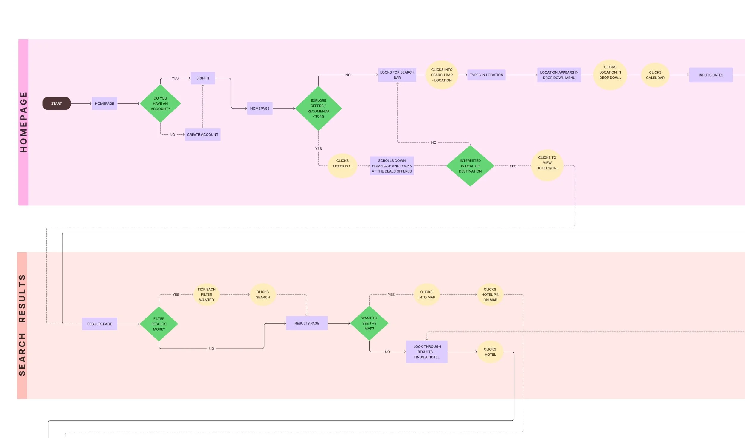 To start the design stage, I created a flow diagram to define each step the user could take on their booking journey. It shows where a process, decision or an action will be taking place and what the user could do in that moment.
