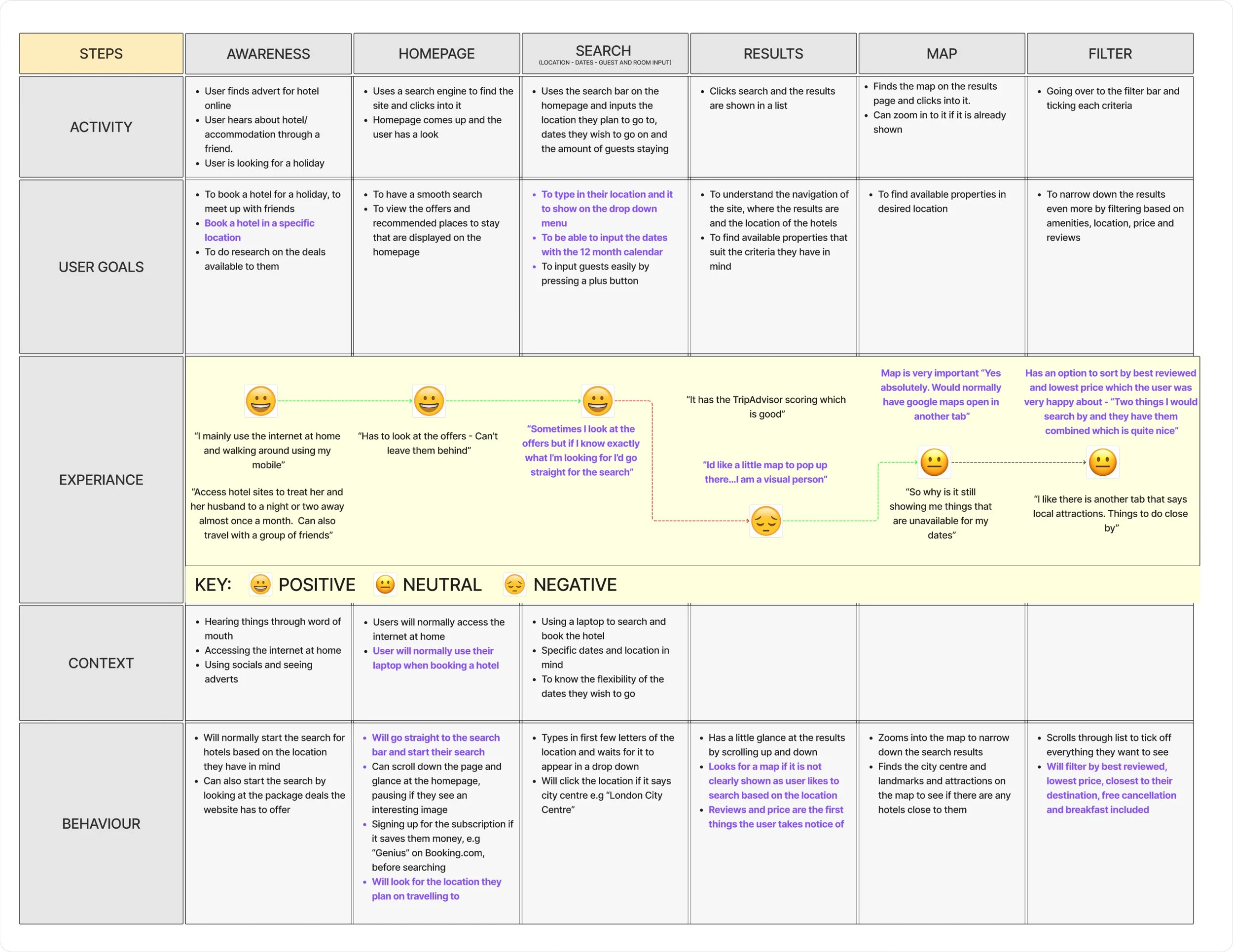After finding the patterns in my research, I could now imagine how the average user would go from the homepage to the booking page of a hotel booking site. I then created a customer journey map to visualise this journey, making clear observations on the effect that each step has on the user. I was able to use this map to find the opportunities I could take with my project to improve the user experience.