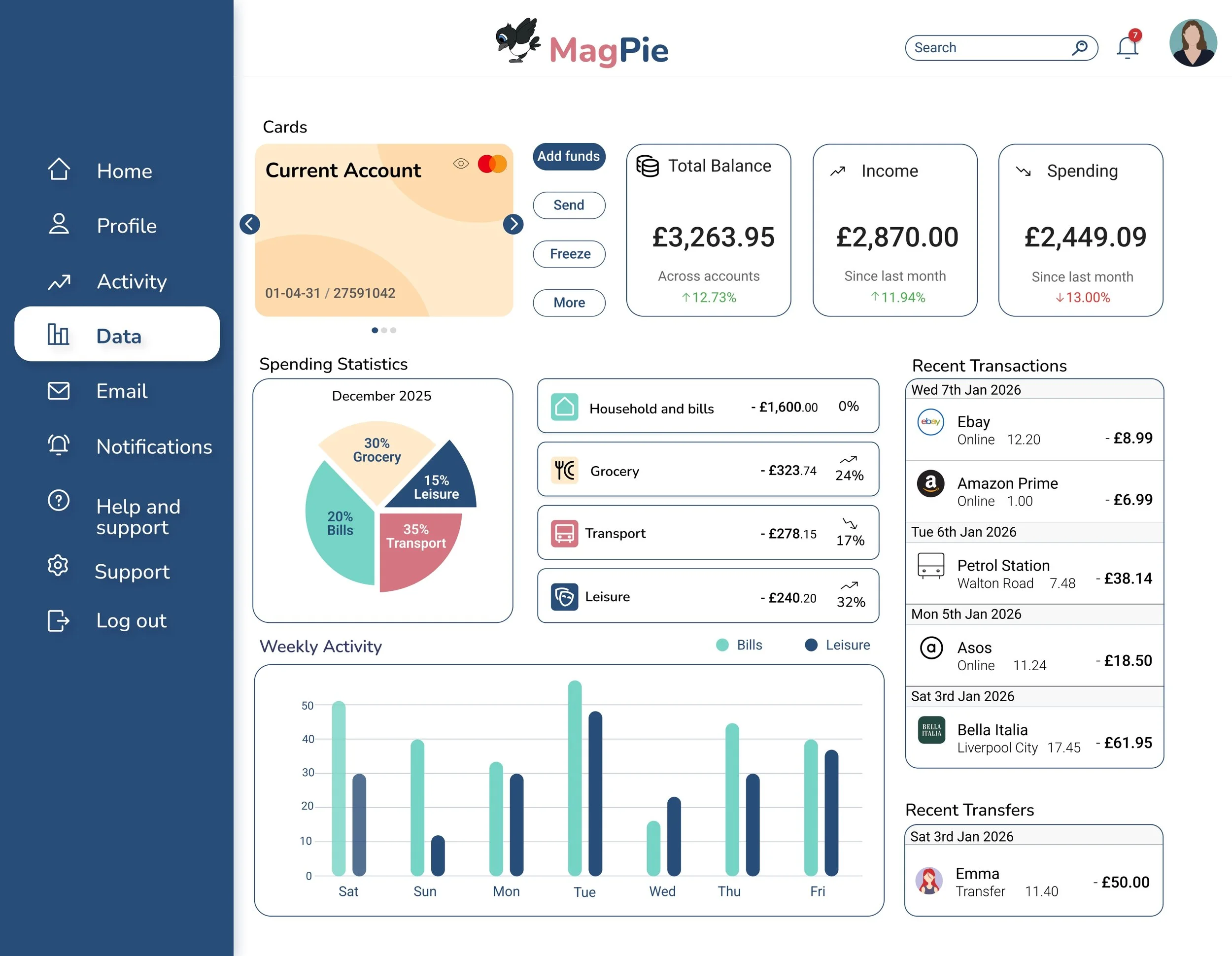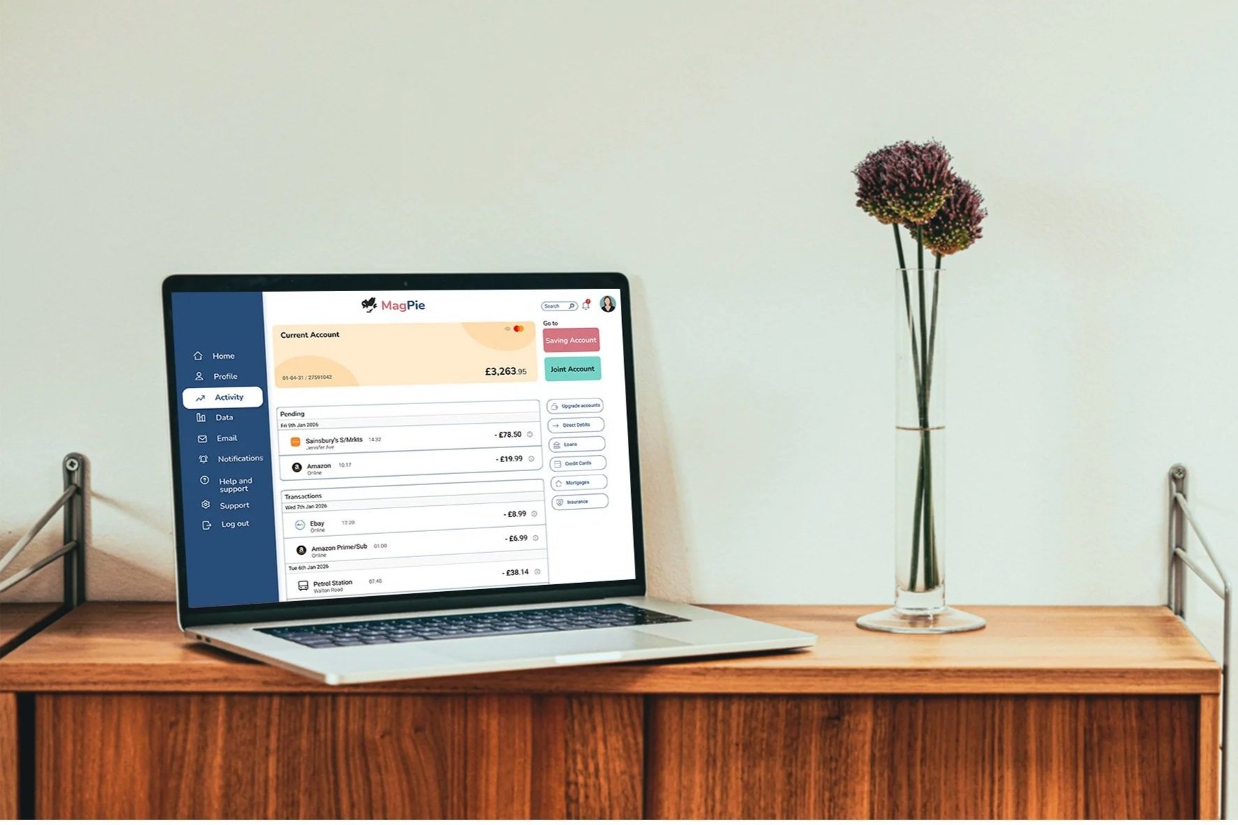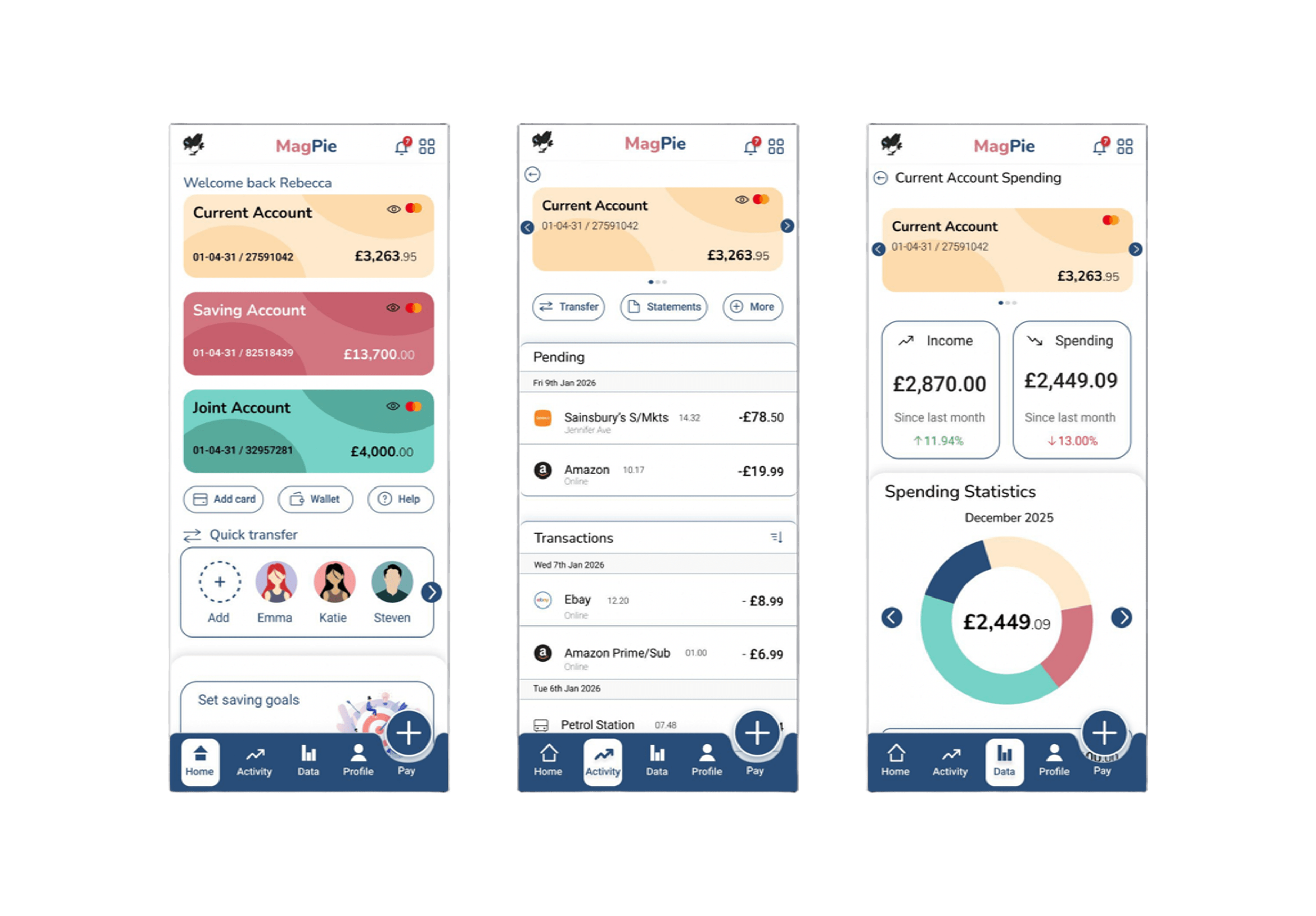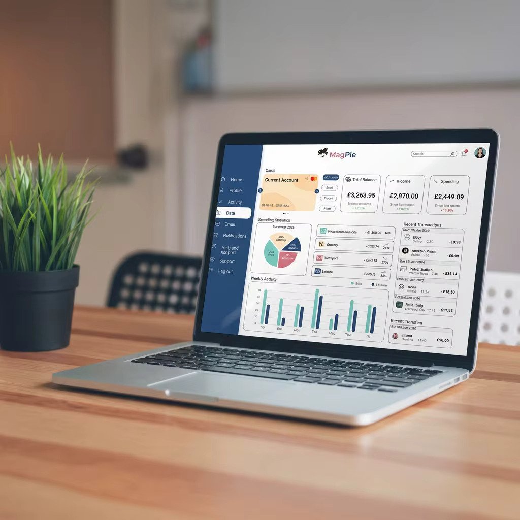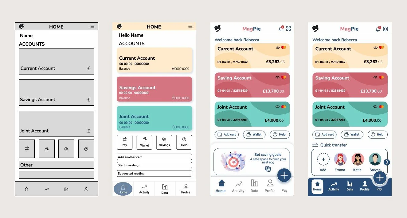 Tasked with designing a mobile banking app that embodied the qualities of trustworthiness, clear and playfulness. The project began with research into brands that shared these traits to gather inspiration. I then carried out research on design elements such as colour, typography and icons. Several screen iterations were created, progressing from wireframes to the final design. The completed screens included the home page, current account, and spending page for mobile, tablet and desktop.