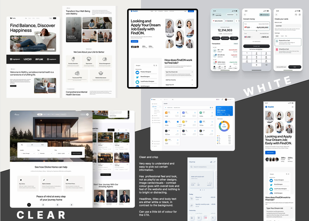 On the clear mood board, most examples feature black text against a white background for strong contrast. Playful brands attract users with vibrant colours and fun illustrations, while the colour blue often conveys a sense of trustworthiness.