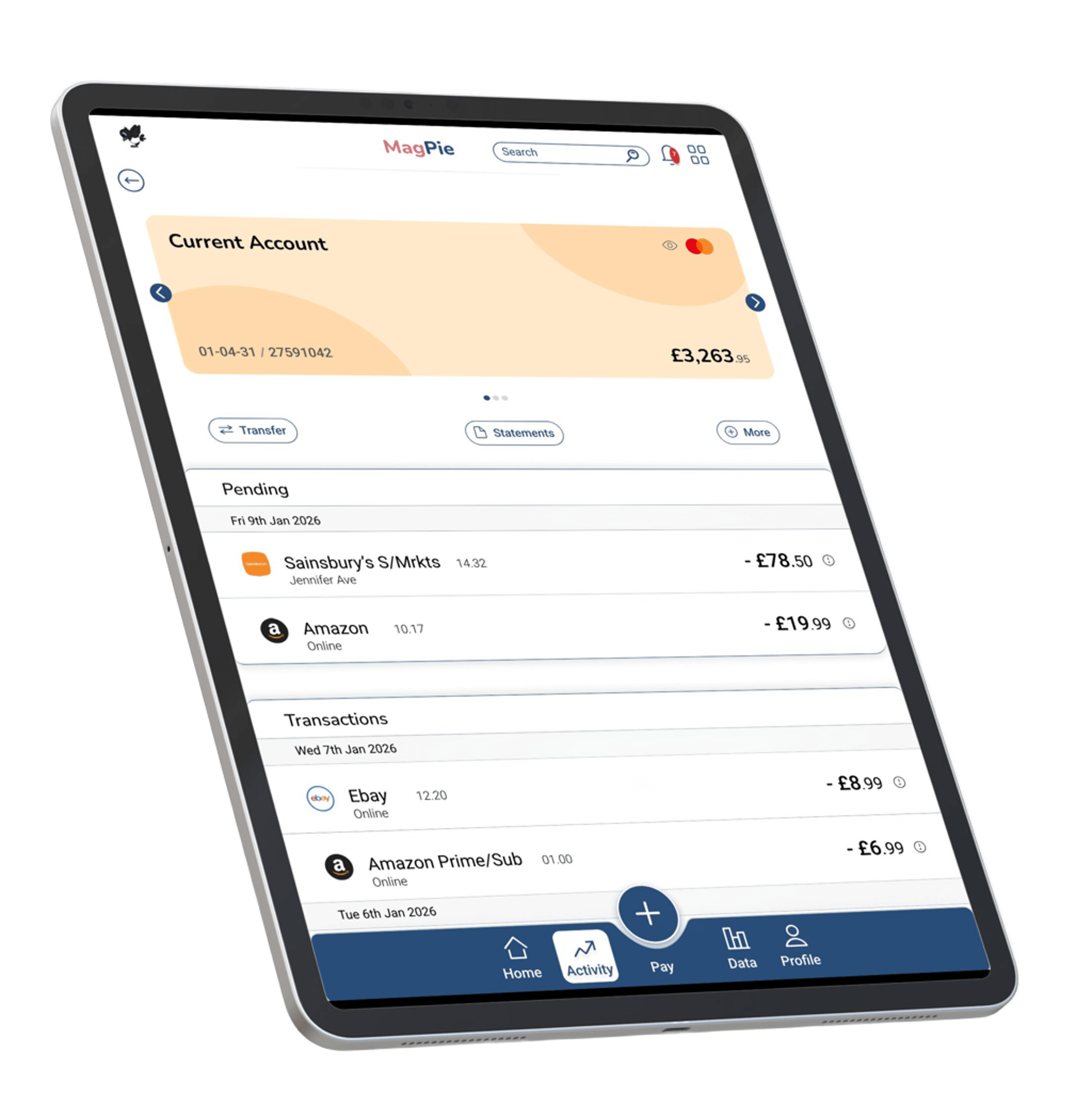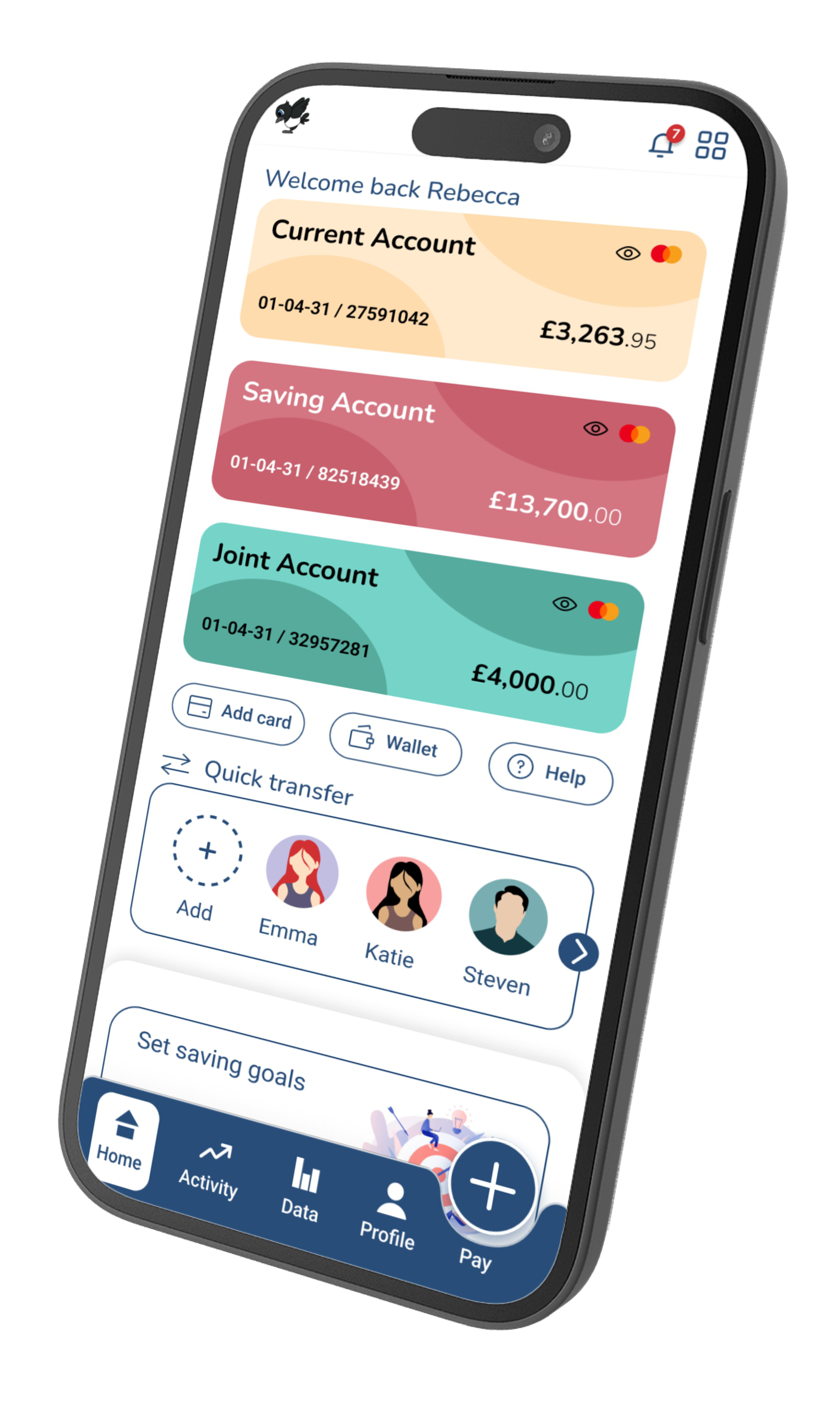 The main task on a banking app is paying or sending money, so a pay button was placed at the bottom right of the screen to make it easy to reach. This CTA could allow the user to complete their task quicker.